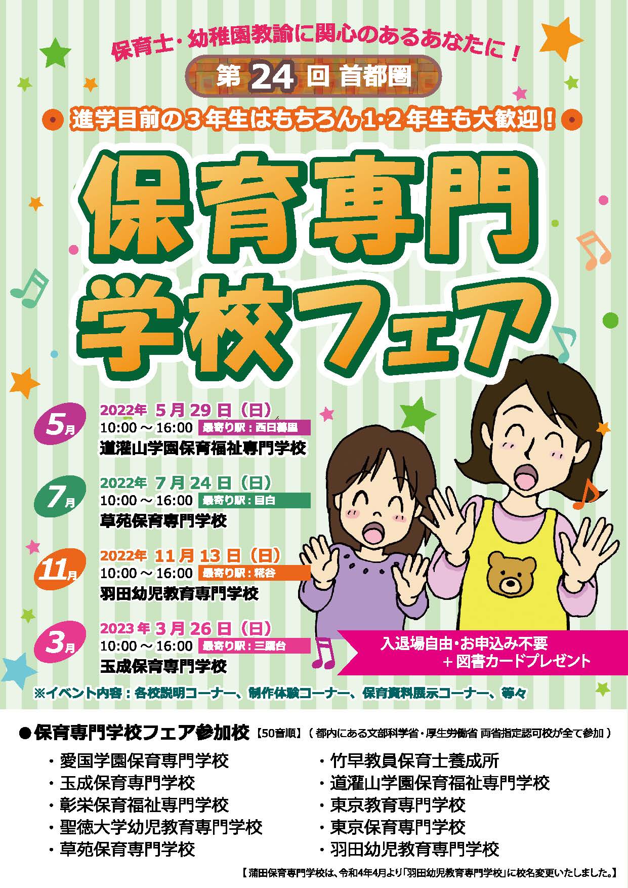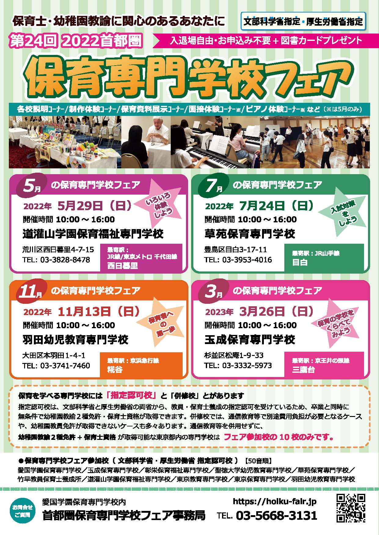保育士・幼稚園教諭に関心のあるあなたに、第24回 2022首都圏保育専門学校フェアを下記日程で開催します。